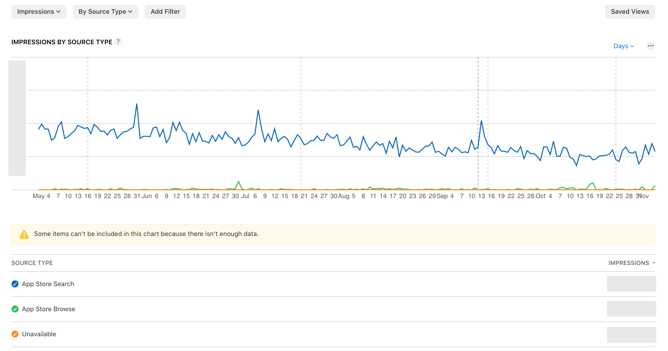 You can fetch reporting data from your App Store Connect integration filtered either by App Store Search,App Store Browse, App Referrer or Web Referrer. This API doesn't provide data for the source types Institutional Purchase, Event Notification or Unavailable.